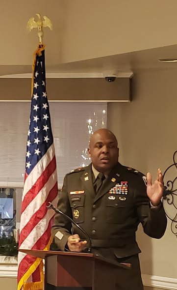 A dinner break was taken. Following dinner, COL. Troy Johnson, APG Garrison Commander, was introduced and spoke on the role of Aberdeen Proving Ground since its inception in 1917. At the end of his presentation, Bob presented Colonel Johnson with a certificate of appreciation and said that a donation would be made in his name to the MOAA scholarship fund.