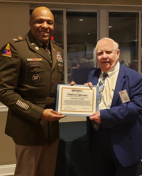 A dinner break was taken. Following dinner, COL. Troy Johnson, APG Garrison Commander, was introduced and spoke on the role of Aberdeen Proving Ground since its inception in 1917. At the end of his presentation, Bob presented Colonel Johnson with a certificate of appreciation and said that a donation would be made in his name to the MOAA scholarship fund.